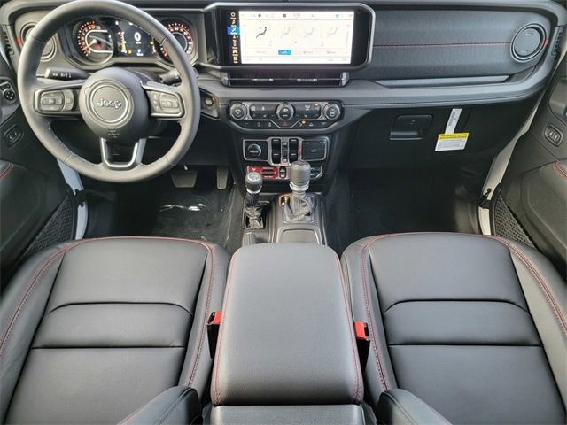 bright white clearcoat 2026 Jeep Gladiator Rubicon 4WD 8-Speed Automatic 3.6L V6 24V VVT 110 Mph Vehicle Max Speed Calibration, 12.3" Touchscreen Display, 4-Wheel Disc Brakes, 4.10 Rear Axle Ratio, 4G LTE Wi-Fi Hot Spot, 8 Speakers, ABS brakes, Air Conditioning, Alexa Built-in, Alloy wheels, Alpine Premium Audio System, AM/FM radio: SiriusXM with 360L, Apple CarPlay, Apple CarPlay/Android Auto, Auto High Beam Headlamp Control, Auto-Dimming Rear-View Mirror, Automatic temperature control, Blind Spot and Cross Path Detection, Bluetooth® Wireless Speaker, Body Color 3-Piece Hard Top, Body Color Rubicon Highline Flare, Brake assist, Cloth Low-Back Bucket Seats, Compass, Connectivity - US/Canada, Delay-off headlights, Driver door bin, Driver vanity mirror, Dual front impact airbags, Dual front side impact airbags, Electronic Stability Control, Emergency communication system: Jeep Connect, Freedom Panel Storage Bag, Front anti-roll bar, Front Bucket Seats, Front Center Armrest w/Storage, Front dual zone A/C, Front fog lights, Front License Plate Bracket, Front reading lights, Full Length Floor Console Premium Armrest, Fully automatic headlights, Google Android Auto, Heated door mirrors, Heated Front Seats, Heated Steering Wheel, Illuminated entry, Integrated Off-Road Camera, Integrated roll-over protection, Integrated Voice Command with Bluetooth®, Leather Wrapped Park Brake Handle, Leather Wrapped Shift Knob, Low tire pressure warning, MOPAR All-Weather Slush Mats, MOPAR Hardtop Headliner, MOPAR Spray in Bedliner, Occupant sensing airbag, Outside temperature display, Overhead airbag, Panic alarm, ParkSense Rear Park Assist System, Passenger door bin, Passenger vanity mirror, Performance Suspension, Power 4-Way Driver Lumbar Adjust, Power 4-Way Passenger Lumbar Adjust, Power Adjust 8-Way Driver Seat, Power Adjust 8-Way Front Passenger Seat, Power Adjust Nappa Leather Seats, Power Dome Dual Vented Hood, Power door mirrors, Power steering, Power windows, Premium Door Trim Panel, Quick Order Package 24Y Rubicon X, Radio data system, Radio: Uconnect 5 Navigation with 12.3" Display, Radio: Uconnect 5 with 12.3" Display, Rear anti-roll bar, Rear Armrest with Cupholder Seat, Rear reading lights, Rear Sliding Window, Rear Window Defroster, Remote keyless entry, Rubicon Hood Top Decal, Security system, Speed control, Split folding rear seat, Steel Front Bumper, Steel Power Dome Hood Package, Steering wheel mounted audio controls, Tachometer, Telescoping steering wheel, Tilt steering wheel, Traction control, Trip computer, Universal Garage Door Opener, USB Host Flip, Variably intermittent wipers, Voltmeter, Wheels: 17" x 7.5" Machined with Black Pockets, Wheels: 17" x 7.5" Machined/Painted Black.