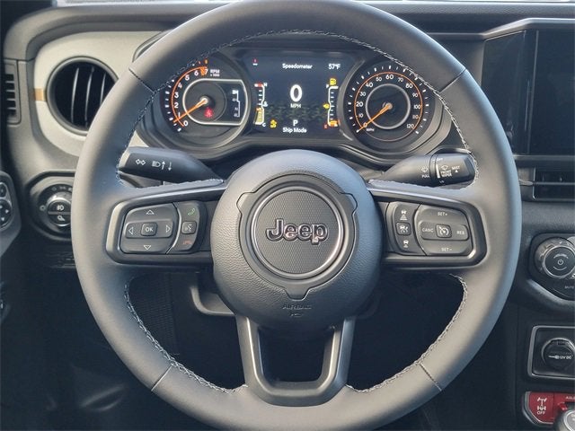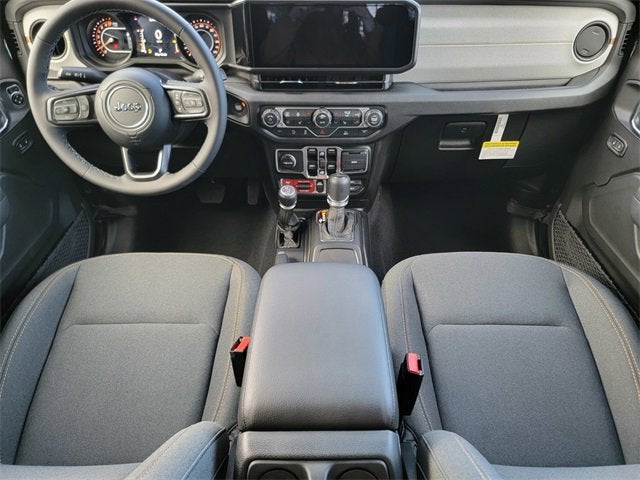 black clearcoat 2026 Jeep Gladiator Willys 4WD 8-Speed Automatic 3.6L V6 24V VVT 110 Mph Vehicle Max Speed Calibration, 115V Auxiliary Power Outlet, 12.3" Touchscreen Display, 2-Piece Body Color Fender Flares, 3.73 Rear Axle Ratio, 4-Wheel Disc Brakes, 4-Wheel Drive Decal, 400W Inverter, 4G LTE Wi-Fi Hot Spot, 8 Speakers, ABS brakes, Advanced Brake Assist, Air Conditioning, Air Conditioning with Auto Temp Control, Alexa Built-in, Alpine Premium Audio System, AM/FM radio: SiriusXM with 360L, Apple CarPlay, Apple CarPlay/Android Auto, Auto-Dimming Rear-View Mirror, Automatic Headlamps, Auxiliary Switches, Black 3-Piece Hard Top, Black Grille with Gloss Black Rings, Brake assist, Class IV Receiver Hitch, Cluster 7.0" TFT Color Display, Compass, Connected Travel and Traffic Services, Connectivity - US/Canada, Convenience Group, Corning Gorilla Glass, Daytime Running Lamp System, Daytime Running Lamps LED Accents, Deep Tint Sunscreen Windows, Delay-off headlights, Driver door bin, Driver vanity mirror, Dual front impact airbags, Dual front side impact airbags, E-Locker Rear Axle, Electronic Stability Control, Emergency/Assistance Call, Freedom Panel Storage Bag, Front anti-roll bar, Front Bucket Seats, Front Center Armrest w/Storage, Front Door Locks 2-Door Passive Entry, Front fog lights, Front Heavy Duty Red Accent Shock Absorbers, Front LED Fog Lamps, Front License Plate Bracket, Front reading lights, Full Speed Forward Collision Warning Plus, Google Android Auto, GPS Navigation, HD Radio, Heated Front Seats, Heated Steering Wheel, Heavy-Duty Engine Cooling, Illuminated entry, Integrated roll-over protection, Integrated Voice Command with Bluetooth®, LED Premium Reflector Headlamps, LED Taillamps, Low tire pressure warning, Media Hub with 2 Charge Only USBs, Mold in Color Bumper with Gloss Black, MOPAR All-Weather Slush Mats, Normal Duty Suspension, Occupant sensing airbag, Off-Road Plus Mode, Outside temperature display, Overhead airbag, Panic alarm, ParkView Rear Back-Up Camera, Passenger door bin, Passenger vanity mirror, Power Heated Mirrors, Power steering, Power windows, Premium Wrapped Steering Wheel, Protection Sill Rails, Quick Order Package 24W Willys, Radio data system, Radio: Uconnect 5 Navigation with 12.3" Display, Radio: Uconnect 5 with 12.3" Display, Rear anti-roll bar, Rear Heavy Duty Red Accent Shock Absorbers, Rear reading lights, Rear Sliding Window, Rear Window Defroster, Remote keyless entry, Remote Start System, Security Alarm, Speed control, Split folding rear seat, Steering wheel mounted audio controls, Sun Visors with Illuminated Vanity Mirrors, Tachometer, Technology Group, Telescoping steering wheel, Tilt steering wheel, Traction control, Trailer Hitch Zoom, Trip computer, Universal Garage Door Opener, USB Host Flip, Variably intermittent wipers, Voltmeter, Wheels: 17" x 7.5" Black Steel Styled, Wheels: 17" x 7.5" Painted Black, Willys Hood Decal, Willys Suspension.