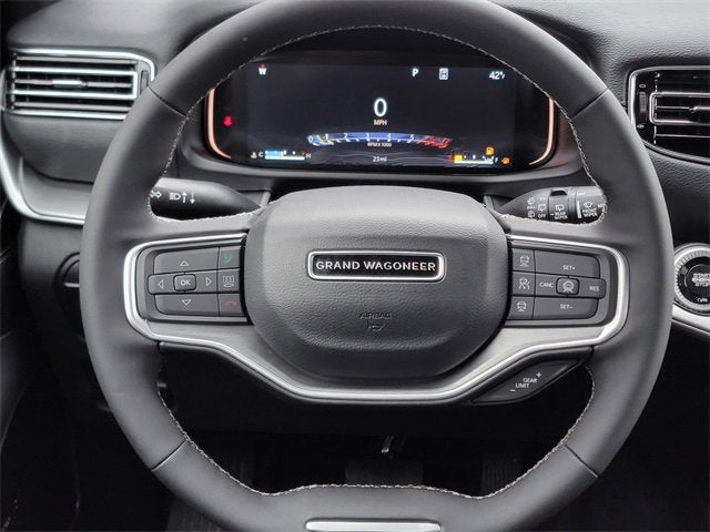 High Gloss Black 2026 Jeep Grand Wagoneer 4WD 8-Speed Automatic 3.0L I6 118 Mph Maximum Speed Calibration, 19 Speaker McIntosh Audio System, 3 Panel Sunroof, 3.55 Rear Axle Ratio, 3rd row seats: bench, 4-Wheel Disc Brakes, 9 Speakers, ABS brakes, Air Conditioning, Alloy wheels, Altitude Appearance Package, AM/FM radio: SiriusXM with 360L, Anti-whiplash front head restraints, Apple CarPlay/Android Auto, Audio memory, Auto Adjust in Reverse Exterior Mirrors, Auto High-beam Headlights, Auto-dimming door mirrors, Auto-Dimming Exterior Driver Mirror, Auto-dimming Rear-View mirror, Auto-leveling suspension, Automatic temperature control, Black Exterior Accents, Brake assist, Bumpers: body-color, Cargo Cover, Compass, Delay-off headlights, Driver door bin, Driver vanity mirror, Driver's Seat Mounted Armrest, Dual front impact airbags, Dual front side impact airbags, Electronic Stability Control, Emergency communication system: Jeep Connect, Exterior Mirrors Approach Lamps, Exterior Mirrors with Memory, Exterior Mirrors with Supplemental Signals, Exterior Parking Camera Rear, Four wheel independent suspension, Front anti-roll bar, Front Bucket Seats, Front Center Armrest w/Storage, Front dual zone A/C, Front fog lights, Front reading lights, Fully automatic headlights, Garage door transmitter, Heated door mirrors, Heated Exterior Mirrors, Heated front seats, Heated rear seats, Heated steering wheel, Illuminated entry, Interior Rear Facing Camera, Knee airbag, Leather Trimmed Bucket Seats, Low tire pressure warning, Luxury Front and Rear Floor Mats, Memory seat, Navigation System, Normal Duty Suspension, Occupant sensing airbag, Outside temperature display, Overhead airbag, Overhead console, Panic alarm, Passenger door bin, Passenger seat mounted armrest, Passenger vanity mirror, Power Deployable Running Boards, Power door mirrors, Power driver seat, Power Liftgate, Power passenger seat, Power steering, Power windows, Premium Group II, Quick Order Package 29X Altitude, Radio data system, Radio: Uconnect 5 Nav with 12.0" Display, Rain sensing wipers, Rear air conditioning, Rear anti-roll bar, Rear reading lights, Rear seat center armrest, Rear window defroster, Rear window wiper, Reclining 3rd row seat, Remote keyless entry, Reversible Carpet/Vinyl Cargo Mat, Security system, Speed control, Speed-sensing steering, Speed-Sensitive Wipers, Split folding rear seat, Steering wheel memory, Steering wheel mounted audio controls, Tachometer, Telescoping steering wheel, Tilt steering wheel, Titanium Daylight Opening Upper, Titanium Upper Grille Applique, Traction control, Trip computer, Turn signal indicator mirrors, Variably intermittent wipers, Ventilated front seats, Ventilated rear seats, Voltmeter, Wheels: 20" x 9" Aluminum Painted, Wheels: 22" x 9" Painted Gloss Black.