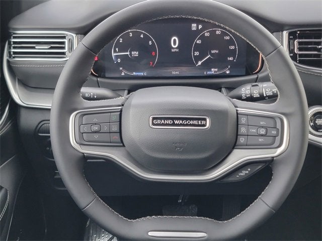 High Gloss Black 2026 Jeep Grand Wagoneer 4WD 8-Speed Automatic 3.0L I6 118 Mph Maximum Speed Calibration, 19 Speaker McIntosh Audio System, 2nd Row Manual Window Shades, 3 Panel Sunroof, 3.55 Rear Axle Ratio, 3rd row seats: bench, 4-Wheel Disc Brakes, 9 Speakers, ABS brakes, Air Conditioning, Alloy wheels, AM/FM radio: SiriusXM with 360L, Anti-whiplash front head restraints, Apple CarPlay/Android Auto, Audio memory, Auto Adjust in Reverse Exterior Mirrors, Auto High-beam Headlights, Auto-dimming door mirrors, Auto-Dimming Exterior Driver Mirror, Auto-dimming Rear-View mirror, Auto-leveling suspension, Automatic temperature control, Black Appearance Package, Black Exterior Accents, Brake assist, Bumpers: body-color, Cargo Cover, Cluster 12" TFT Color Display, Compass, Delay-off headlights, Driver door bin, Driver vanity mirror, Driver's Seat Mounted Armrest, Dual front impact airbags, Dual front side impact airbags, Electronic Stability Control, Emergency communication system: Jeep Connect, Exterior Mirrors Approach Lamps, Exterior Mirrors with Memory, Exterior Mirrors with Supplemental Signals, Exterior Parking Camera Rear, Four wheel independent suspension, Front anti-roll bar, Front Bucket Seats, Front Center Armrest w/Storage, Front dual zone A/C, Front fog lights, Front reading lights, Fully automatic headlights, Garage door transmitter, Heads-Up Display, Heated door mirrors, Heated Exterior Mirrors, Heated front seats, Heated rear seats, Heated steering wheel, Illuminated entry, Instrument Panel, Interior Rear Facing Camera, Knee airbag, Leather Trimmed Bucket Seats, Limited Reserve Package, Low tire pressure warning, Luxury Front and Rear Floor Mats, Memory seat, Navigation System, Normal Duty Suspension, Occupant sensing airbag, Outside temperature display, Overhead airbag, Overhead console, P and P Park and Unpark Assist with Stop System, Panic alarm, Passenger door bin, Passenger seat mounted armrest, Passenger vanity mirror, Power Deployable Running Boards, Power door mirrors, Power driver seat, Power Liftgate, Power passenger seat, Power steering, Power windows, Quadra-Lift Air Suspension, Quick Order Package 29D Reserve, Radio data system, Radio: Uconnect 5 Nav with 12.0" Display, Rain sensing wipers, Rear air conditioning, Rear anti-roll bar, Rear reading lights, Rear seat center armrest, Rear window defroster, Rear window wiper, Reclining 3rd row seat, Remote keyless entry, Reversible Carpet/Vinyl Cargo Mat, Security system, Semi Active Damping, Side Distance Warning, Smartphone as a Key Prep, Speed control, Speed-sensing steering, Speed-Sensitive Wipers, Split folding rear seat, Steering wheel memory, Steering wheel mounted audio controls, Surround View Camera System, Tachometer, Telescoping steering wheel, Tilt steering wheel, Titanium Daylight Opening Upper, Titanium Upper Grille Applique, Traction control, Trip computer, Turn signal indicator mirrors, Variably intermittent wipers, Ventilated front seats, Ventilated rear seats, Voltmeter, Wheels: 22" x 9" Painted Gloss Black.