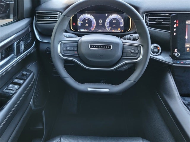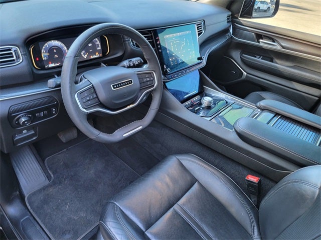 CPO Gold Certified, 3 Panel Sunroof, Adjustable Roof Rail Crossbars, Cargo Cover, Premium Group I, Quick Order Package 25E, Reversible Carpet/Vinyl Cargo Mat, Wheels: 20 x 9.0 Premium 2 Aluminum, 10 Speakers, 3rd row seats: bench, 4-Wheel Disc Brakes, ABS brakes, Adjustable pedals, Air Conditioning, Alloy wheels, AM/FM radio: SiriusXM with 360L, Anti-whiplash front head restraints, Audio memory, Auto-dimming door mirrors, Auto-dimming Rear-View mirror, Auto-leveling suspension, Automatic temperature control, Brake assist, Bumpers: body-color, Compass, Delay-off headlights, Driver door bin, Driver vanity mirror, Driver's Seat Mounted Armrest, Dual front impact airbags, Dual front side impact airbags, Electronic Stability Control, Emergency communication system: Automatic SOS Call, Exterior Parking Camera Rear, Four wheel independent suspension, Front anti-roll bar, Front Bucket Seats, Front Center Armrest w/Storage, Front dual zone A/C, Front fog lights, Front reading lights, Fully automatic headlights, Garage door transmitter, Heated door mirrors, Heated front seats, Heated steering wheel, Illuminated entry, Knee airbag, Leather Trimmed Bucket Seats, Low tire pressure warning, Memory seat, Navigation System, Normal Duty Suspension, Occupant sensing airbag, Outside temperature display, Overhead airbag, Overhead console, Panic alarm, Passenger door bin, Passenger seat mounted armrest, Passenger vanity mirror, Pedal memory, Power adjustable front head restraints, Power door mirrors, Power driver seat, Power Liftgate, Power passenger seat, Power steering, Power windows, Radio data system, Radio: Uconnect 5 Nav w/10.1 Display, Rear air conditioning, Rear anti-roll bar, Rear dual zone A/C, Rear reading lights, Rear seat center armrest, Rear window defroster, Rear window wiper, Reclining 3rd row seat, Remote keyless entry, Security system, Speed control, Speed-sensing steering, Speed-Sensitive Wipers, Split folding rear seat, Steering wheel memory, Steering wheel mounted audio controls, Tachometer, Telescoping steering wheel, Tilt steering wheel, Traction control, Trip computer, Turn signal indicator mirrors, Variably intermittent wipers, Ventilated front seats, Voltmeter, Wheels: 18 x 8.0 Aluminum Base Finish, 3 Panel Sunroof, Adjustable Roof Rail Crossbars, Cargo Cover, Premium Group I, Quick Order Package 25E, Reversible Carpet/Vinyl Cargo Mat, Wheels: 20 x 9.0 Premium 2 Aluminum. Diamond Black Crystal Pearlcoat 2023 Jeep Wagoneer 4WD 8-Speed Automatic 3.0L I6