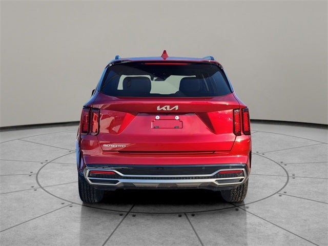 CPO Go Certified, LED Interior Lighting, Panoramic Power Sunroof w/Power Sunshade, Panoramic Sunroof Package, 3.316 Axle Ratio, 3rd row seats: split-bench, 4-Wheel Disc Brakes, 6 Speakers, ABS brakes, Air Conditioning, Alloy wheels, AM/FM radio: SiriusXM, Apple CarPlay & Android Auto, Auto High-beam Headlights, Auto-dimming Rear-View mirror, Automatic temperature control, Brake assist, Bumpers: body-color, Carpet Floor Mats, Delay-off headlights, Driver door bin, Driver vanity mirror, Dual front impact airbags, Dual front side impact airbags, Electronic Stability Control, Emergency communication system, Exterior Parking Camera Rear, Four wheel independent suspension, Front anti-roll bar, Front Bucket Seats, Front Center Armrest, Front dual zone A/C, Front fog lights, Front reading lights, Fully automatic headlights, Heated door mirrors, Heated Front Bucket Seats, Heated front seats, Illuminated entry, Knee airbag, Leather Shift Knob, Leather steering wheel, Low tire pressure warning, Navigation System, Occupant sensing airbag, Outside temperature display, Overhead airbag, Overhead console, Panic alarm, Passenger door bin, Passenger vanity mirror, Power door mirrors, Power driver seat, Power Liftgate, Power passenger seat, Power steering, Power windows, Radio data system, Radio: AM/FM Audio System, Rear air conditioning, Rear anti-roll bar, Rear reading lights, Rear window defroster, Rear window wiper, Remote keyless entry, Roof rack: rails only, Security system, Smart Key w/ Push Button and Remote Start, Speed control, Speed-sensing steering, Split folding rear seat, Spoiler, Steering wheel mounted audio controls, SynTex Artificial Leather Seat Trim, Tachometer, Telescoping steering wheel, Tilt steering wheel, Traction control, Trip computer, Turn signal indicator mirrors, Variably intermittent wipers, Wheels: 7.5J x 18 Machine-Finished Alloy, LED Interior Lighting, Panoramic Power Sunroof w/Power Sunshade, Panoramic Sunroof Package. Passion Red 2023 Kia Sorento EX FWD 8-Speed DCT 2.5L I4 DGI Turbocharged DOHC 16V LEV3-ULEV70 281hp