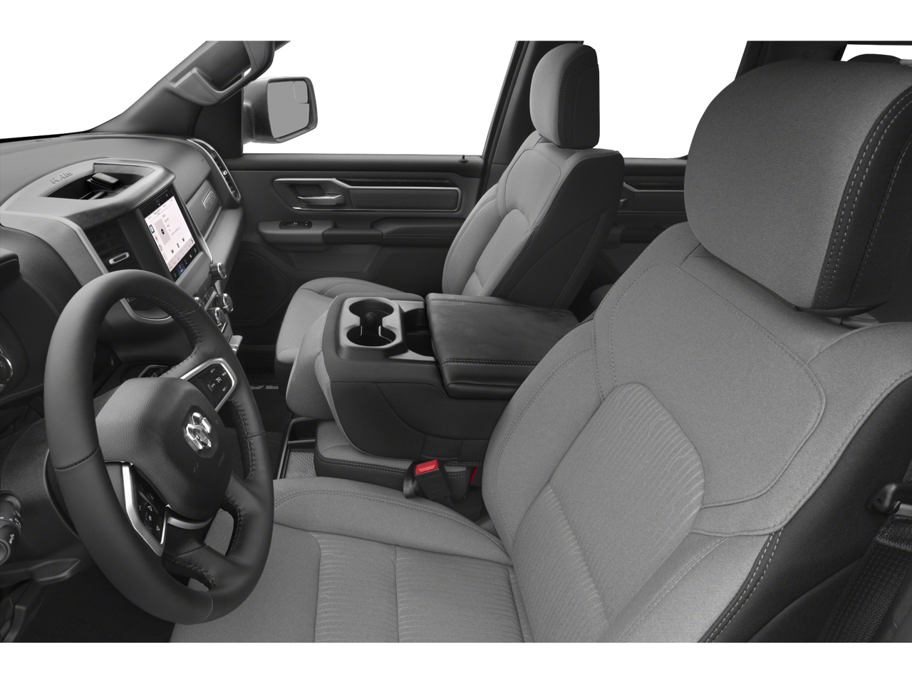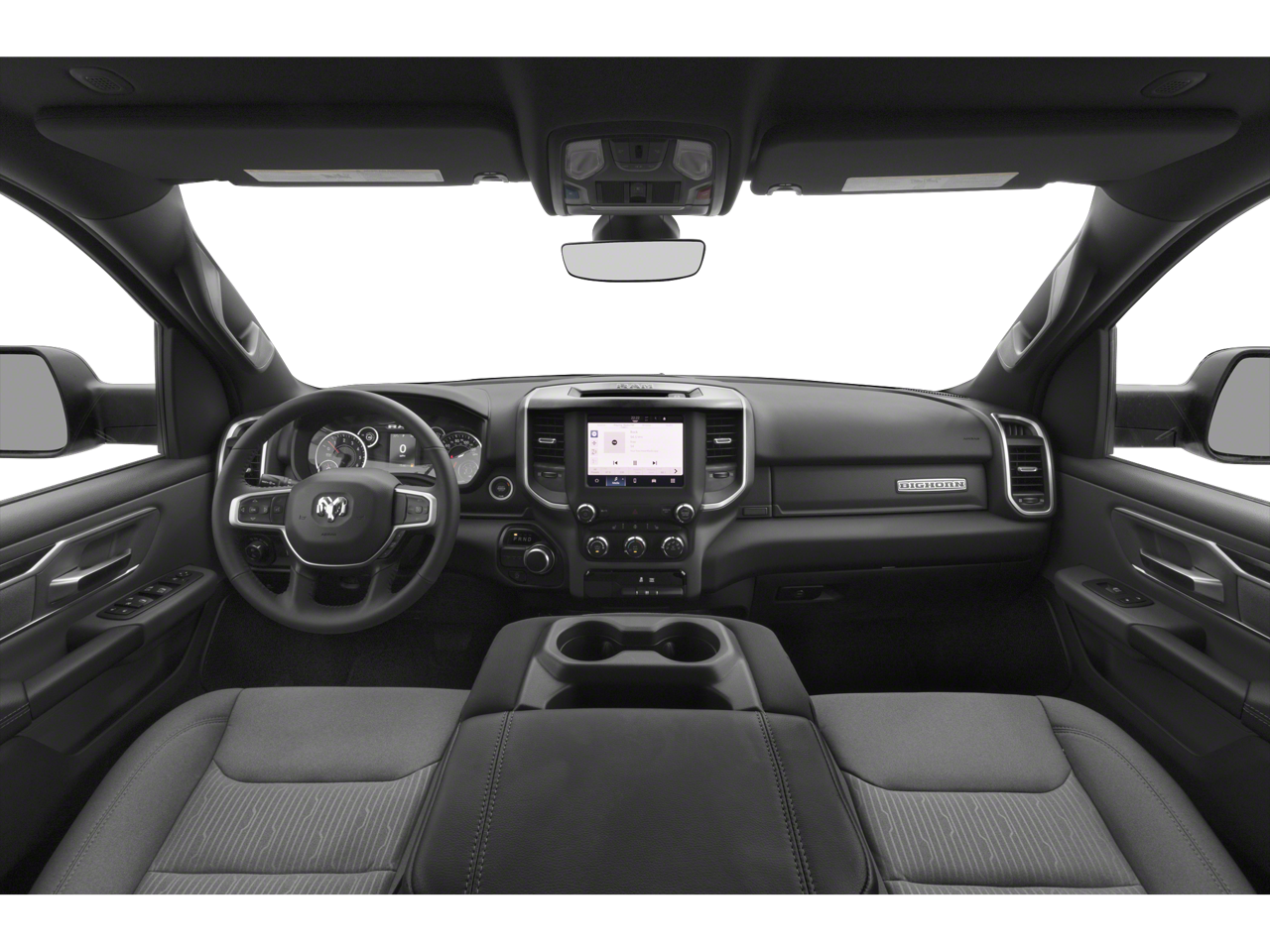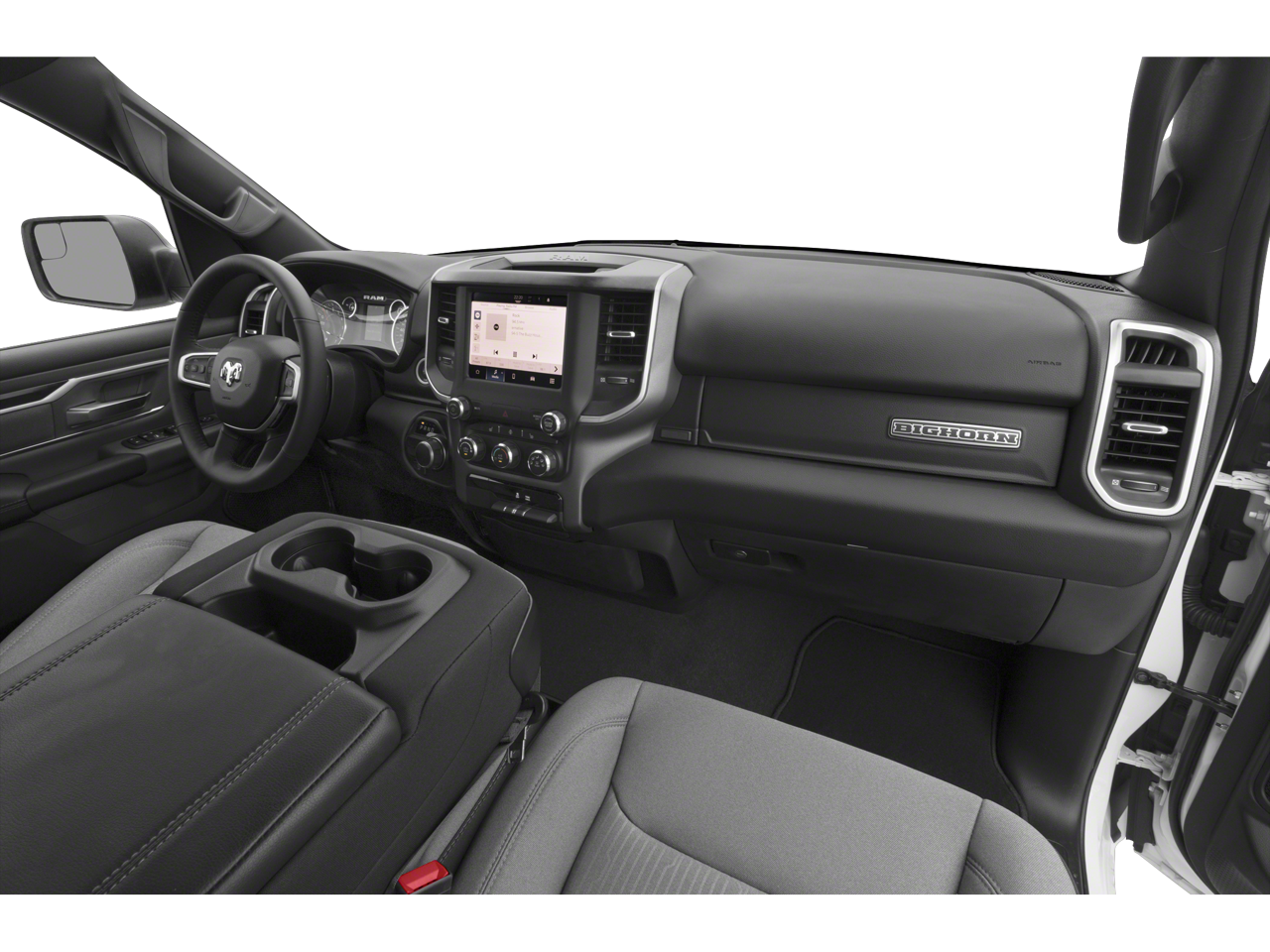 Ram Certified, 115V Auxiliary Power Outlet, 12 Touchscreen Display, 3 Rear Seat Head Restraints, 3.21 Rear Axle Ratio, 4 Way Front Headrests, 4-Wheel Disc Brakes, 400W Inverter, 48V Belt Starter Generator, 4G LTE Wi-Fi Hot Spot, 6 Speakers, 9 Amplified Speakers w/Subwoofer, ABS brakes, Accent Color Door Handles, Accent Color Premium Power Mirrors, Air Conditioning, Air Conditioning ATC w/Dual Zone Control, All R1 High Radios, All Radio Equipped Vehicles, Alloy wheels, AM/FM radio, Anti-Spin Differential Rear Axle, Apple CarPlay, Auto-Dimming Exterior Driver Mirror, Auto-Dimming Rear-View Mirror, Big Horn Badge, Big Horn Level B Equipment Group, Black Exterior Mirrors, Black Exterior Truck Badging, Black Headlamp Bezels, Black Interior Accents, Black Painted Exterior Mirrors Caps, Black Premium Power Mirrors, Body Color Front Bumper, Body Color Rear Bumper w/Step Pads, Brake assist, Bucket Seats, Bumpers: chrome, Center Console Parts Module, Class IV Receiver Hitch, Cloth Bench Seat, Cluster 7.0 TFT Color Display, Compass, Connected Travel & Traffic Services, Connectivity - US/Canada, Convex Wide-Angle Mirror Insert, Delay-off headlights, Deluxe Cloth Bucket Seats, Disassociated Touchscreen Display, Driver door bin, Dual Exhaust w/Black Tips, Dual front impact airbags, Dual front side impact airbags, Electric Shift-On-Demand Transfer Case, Electronic Stability Control, Emergency communication system: SiriusXM Guardian, Exterior Mirrors Courtesy Lamps, Exterior Mirrors w/Heating Element, Exterior Mirrors w/Supplemental Signals, For Details, Visit DriveUconnect.com, For More Info, Call 800-643-2112, Front anti-roll bar, Front Center Armrest w/Storage, Front Fog Lamps, Front License Plate Bracket, Front reading lights, Front Seat Back Map Pockets, Front wheel independent suspension, Full Length Floor Console, Fully automatic headlights, Glove Box Lamp, Google Android Auto, GPS Antenna Input, GPS Navigation, Grille Surround 1 Black Texture 2 Black, HD Radio, Heated door mirrors, Heated Front Seats, Heated Steering Wheel, Illuminated entry, Integrated Center Stack Radio, Integrated Voice Command w/Bluetooth®, Leather steering wheel, LED Footwell Lighting, Low tire pressure warning, Manual Adjust 4-Way Front P