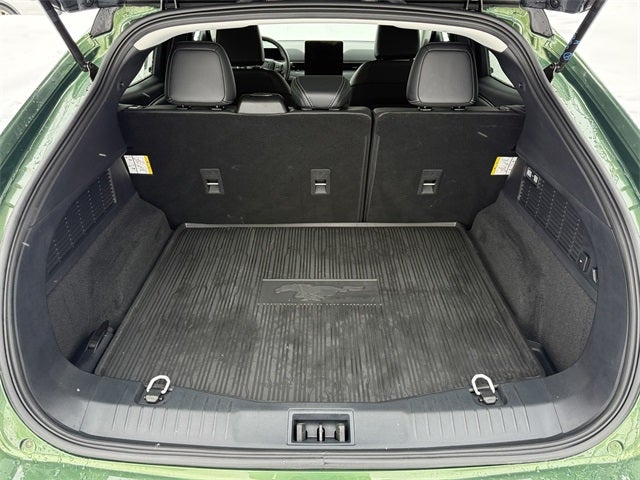 Ford EV Certified Certified, 1st & 2nd Row Floor Liners w/o Carpet Mats, 4-Wheel Disc Brakes, 6 Speakers, ABS brakes, ActiveX Bucket Seats, Air Conditioning, Alloy wheels, AM/FM radio: SiriusXM with 360L, AM/FM Stereo, Apple CarPlay/Android Auto, Auto High-beam Headlights, Auto-dimming Rear-View mirror, Automatic temperature control, Brake assist, Bumpers: body-color, Cargo Area Cover, Cargo Floor Liner, Comfort Package Lite, Compass, Delay-off headlights, Driver door bin, Driver vanity mirror, Dual front impact airbags, Dual front side impact airbags, Electronic Stability Control, Emergency communication system: 911 Assist, Equipment Group 100A Standard Package, Exterior Parking Camera Rear, Four wheel independent suspension, Front anti-roll bar, Front Bucket Seats, Front Center Armrest, Front dual zone A/C, Front reading lights, Fully automatic headlights, Garage door transmitter, Heated door mirrors, Heated Front Row Seats, Heated Steering Wheel, Illuminated entry, Interior Protection Package, Internet access capable: FordPass Connect, Knee airbag, Low tire pressure warning, Memory Driver's Seat & Sideview Mirrors, Mobile Power Cord (120V/240V), Navigation system: Connected Navigation, Occupant sensing airbag, Outside temperature display, Overhead airbag, Overhead console, Panic alarm, Passenger door bin, Passenger vanity mirror, Power door mirrors, Power driver seat, Power steering, Power windows, Radio data system, Rain sensing wipers, Rear anti-roll bar, Rear seat center armrest, Rear side impact airbag, Rear window defroster, Rear window wiper, Remote keyless entry, Security system, SiriusXM w/360L, Speed control, Speed-sensing steering, Speed-Sensitive Wipers, Split folding rear seat, Spoiler, Steering wheel mounted audio controls, SYNC 4A w/Enhanced Voice Recognition, Telescoping steering wheel, Tilt steering wheel, Traction control, Trip computer, Turn signal indicator mirrors, Variably intermittent wipers, Wheels: 19 Machined-Face Aluminum. Green Metallic 2025 Ford Mustang Mach-E Select AWD Single-Speed Automatic Electric Motor